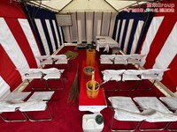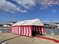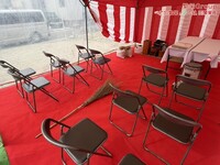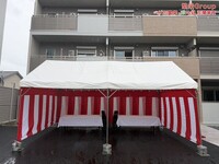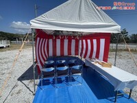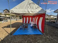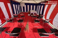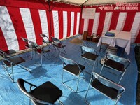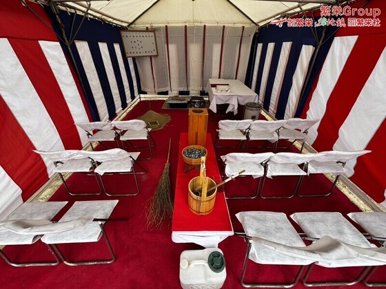清竹4本/木杭4本/注連縄20m1本/清砂2斗/テント2間×3間/紅白幕2枚/長方形テーブル(白クロス付)2台/パイプイス12脚