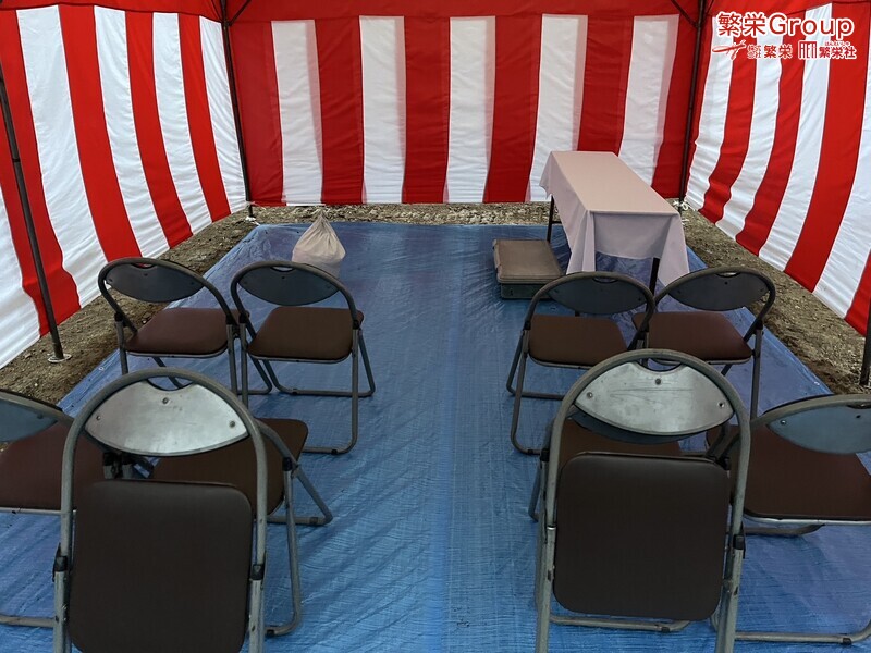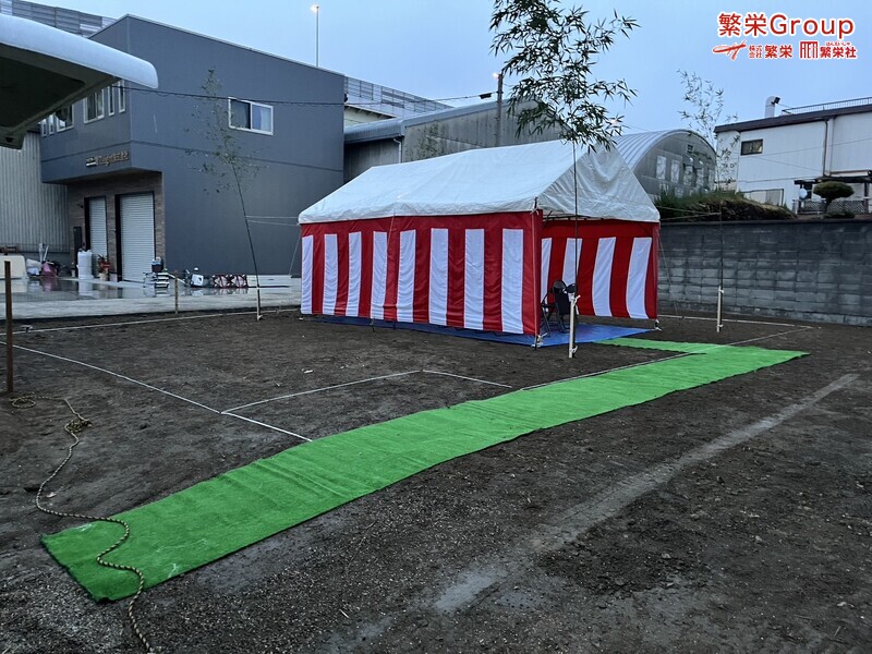地鎮祭とは、建築工事や土木工事を行う前に、土地の神様を祀り、工事の安全や土地・ 建物の末永い安全を祈願する儀式です。 株式会社繁栄はテントレンタル・式典&地鎮祭レンタル・地鎮祭セット設営 地鎮祭テント・用品全般レンタル致します。