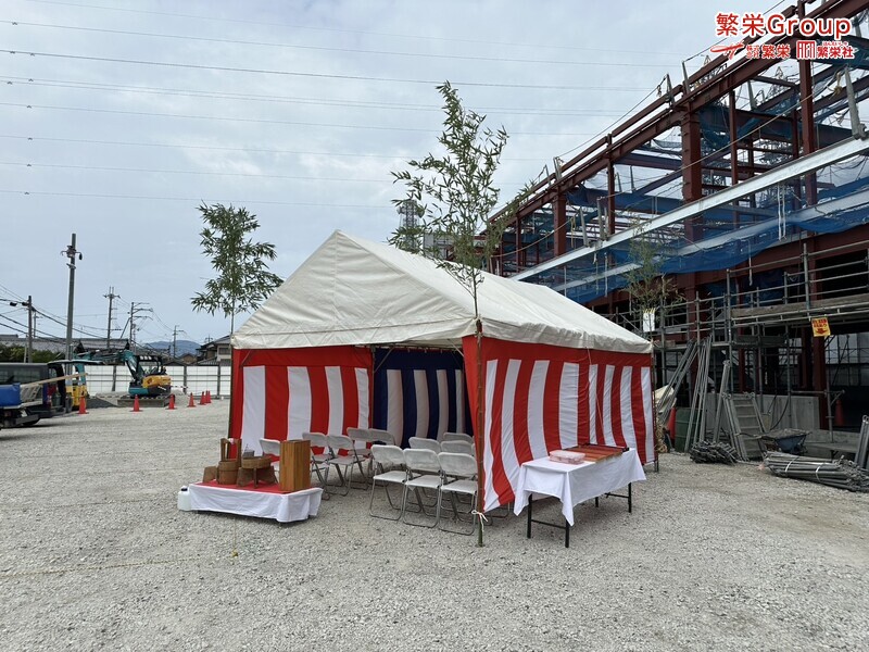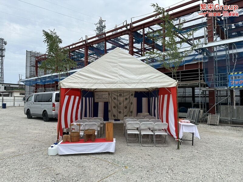 地鎮祭とは、建築工事や土木工事を行う前に、土地の神様を祀り、工事の安全や土地・ 建物の末永い安全を祈願する儀式です。 株式会社繁栄はテントレンタル・式典&地鎮祭レンタル・地鎮祭セット設営 地鎮祭テント・用品全般レンタル致します。