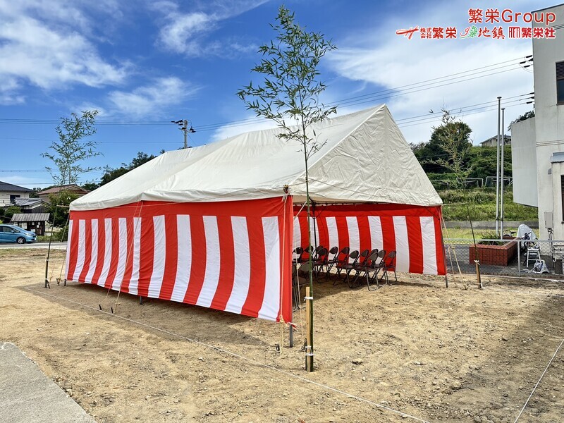 地鎮祭とは、建築工事や土木工事を行う前に、土地の神様を祀り、工事の安全や土地・ 建物の末永い安全を祈願する儀式です。 株式会社繁栄はテントレンタル・式典&地鎮祭レンタル・地鎮祭セット設営 地鎮祭テント・用品全般レンタル致します。