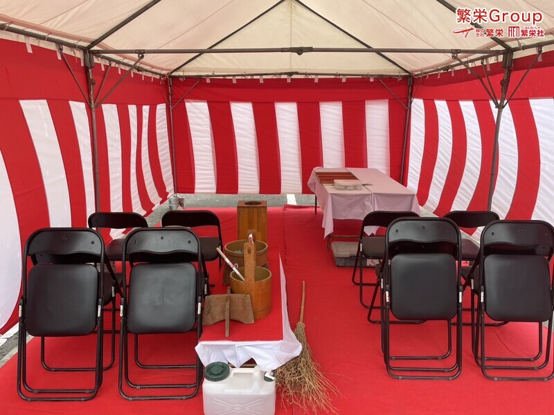 地鎮祭とは、建築工事や土木工事を行う前に、土地の神様を祀り、工事の安全や土地・ 建物の末永い安全を祈願する儀式です。 株式会社繁栄はテントレンタル・式典&地鎮祭レンタル・地鎮祭セット設営 地鎮祭テント・用品全般レンタル致します。