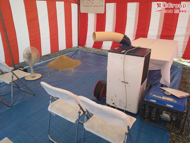 地鎮祭とは、建築工事や土木工事を行う前に、土地の神様を祀り、工事の安全や土地・ 建物の末永い安全を祈願する儀式です。 株式会社繁栄はテントレンタル・式典&地鎮祭レンタル・地鎮祭セット設営 地鎮祭テント・用品全般レンタル致します。