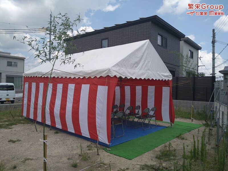 地鎮祭とは、建築工事や土木工事を行う前に、土地の神様を祀り、工事の安全や土地・ 建物の末永い安全を祈願する儀式です。 株式会社繁栄はテントレンタル・式典&地鎮祭レンタル・地鎮祭セット設営 地鎮祭テント・用品全般レンタル致します。