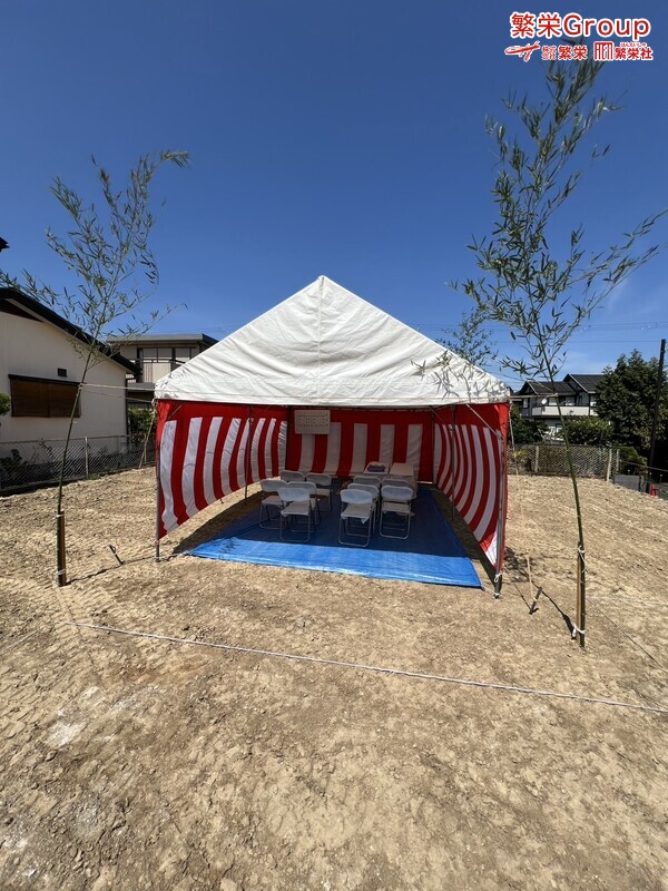 地鎮祭とは、建築工事や土木工事を行う前に、土地の神様を祀り、工事の安全や土地・ 建物の末永い安全を祈願する儀式です。 株式会社繁栄はテントレンタル・式典&地鎮祭レンタル・地鎮祭セット設営 地鎮祭テント・用品全般レンタル致します。