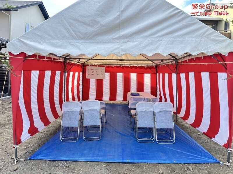 地鎮祭とは、建築工事や土木工事を行う前に、土地の神様を祀り、工事の安全や土地・ 建物の末永い安全を祈願する儀式です。 株式会社繁栄はテントレンタル・式典&地鎮祭レンタル・地鎮祭セット設営 地鎮祭テント・用品全般レンタル致します。