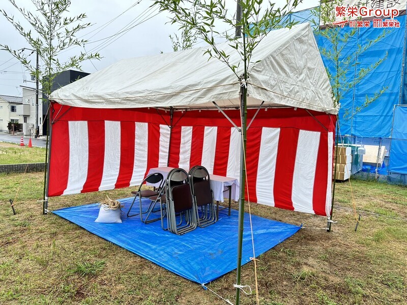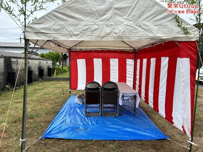 地鎮祭とは、建築工事や土木工事を行う前に、土地の神様を祀り、工事の安全や土地・ 建物の末永い安全を祈願する儀式です。 株式会社繁栄はテントレンタル・式典&地鎮祭レンタル・地鎮祭セット設営 地鎮祭テント・用品全般レンタル致します。