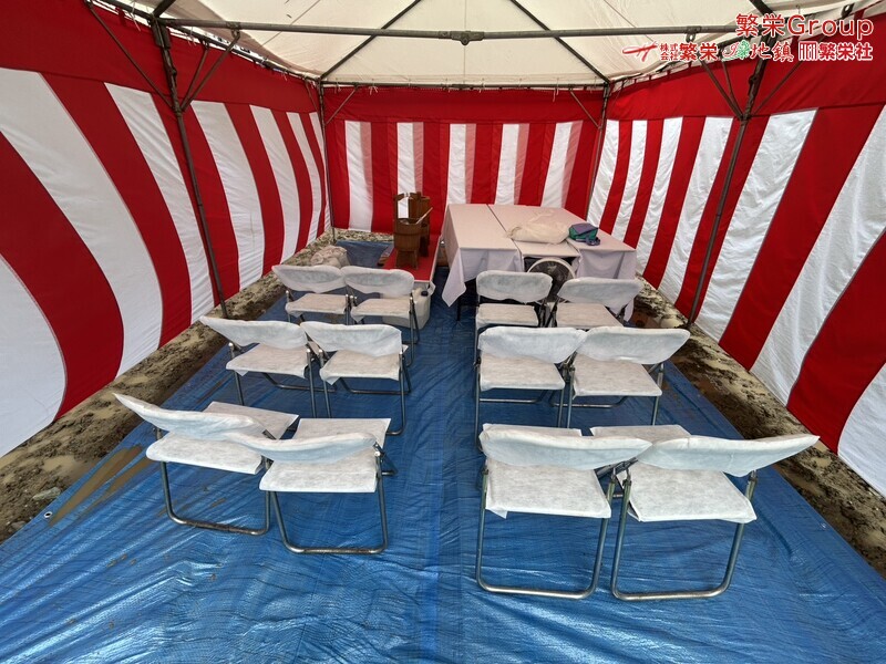 地鎮祭とは、建築工事や土木工事を行う前に、土地の神様を祀り、工事の安全や土地・ 建物の末永い安全を祈願する儀式です。 株式会社繁栄はテントレンタル・式典&地鎮祭レンタル・地鎮祭セット設営 地鎮祭テント・用品全般レンタル致します。