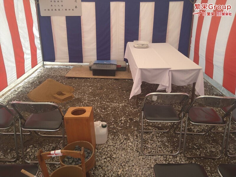 地鎮祭とは、建築工事や土木工事を行う前に、土地の神様を祀り、工事の安全や土地・ 建物の末永い安全を祈願する儀式です。 株式会社繁栄はテントレンタル・式典&地鎮祭レンタル・地鎮祭セット設営 地鎮祭テント・用品全般レンタル致します。