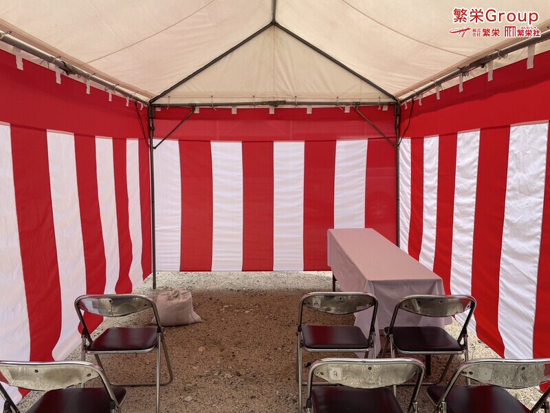 地鎮祭とは、建築工事や土木工事を行う前に、土地の神様を祀り、工事の安全や土地・ 建物の末永い安全を祈願する儀式です。 株式会社繁栄はテントレンタル・式典&地鎮祭レンタル・地鎮祭セット設営 地鎮祭テント・用品全般レンタル致します。