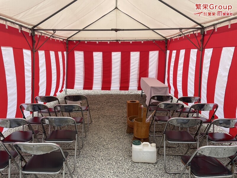 地鎮祭とは、建築工事や土木工事を行う前に、土地の神様を祀り、工事の安全や土地・ 建物の末永い安全を祈願する儀式です。 株式会社繁栄はテントレンタル・式典&地鎮祭レンタル・地鎮祭セット設営 地鎮祭テント・用品全般レンタル致します。