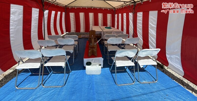 地鎮祭とは、建築工事や土木工事を行う前に、土地の神様を祀り、工事の安全や土地・ 建物の末永い安全を祈願する儀式です。 株式会社繁栄はテントレンタル・式典&地鎮祭レンタル・地鎮祭セット設営 地鎮祭テント・用品全般レンタル致します。