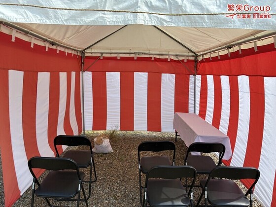 呉市で地鎮祭テントなら株式会社繁栄 地鎮祭テント設営・準備の事なら株式会社繁栄までお申し付けください。 日本全国、地鎮祭テントレンタル全般は株式会社繁栄(地鎮祭