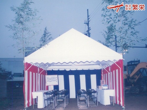 株式会社繁栄は地鎮祭テントの設営・レンタル施工致します。 主に2K×3K、2K×4K、3K×4K、3K×5K、3K×6Kのサイズのテント使用 地鎮祭会場設営