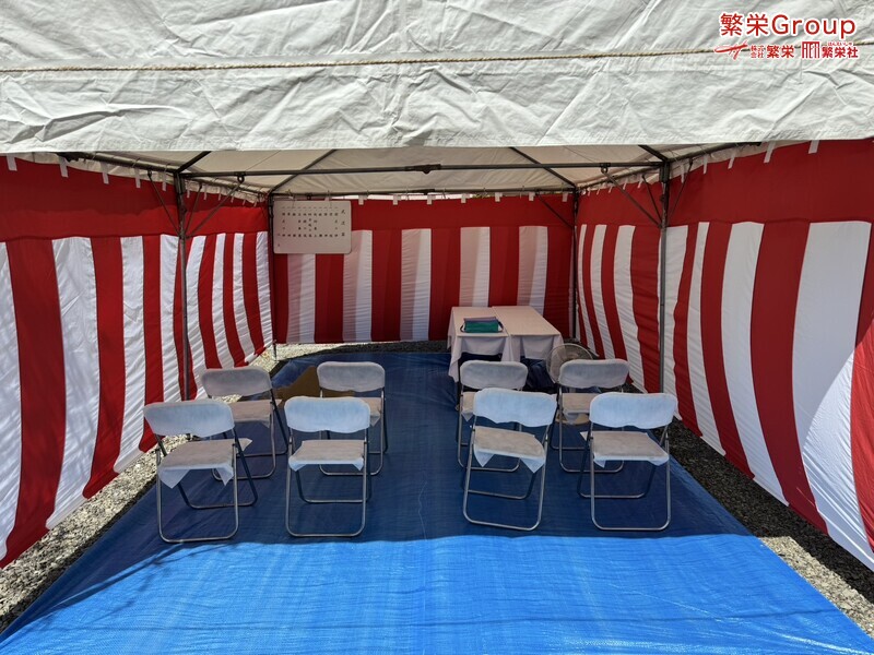 地鎮祭とは、建築工事や土木工事を行う前に、土地の神様を祀り、工事の安全や土地・ 建物の末永い安全を祈願する儀式です。 株式会社繁栄はテントレンタル・式典&地鎮祭レンタル・地鎮祭セット設営 地鎮祭テント・用品全般レンタル致します。