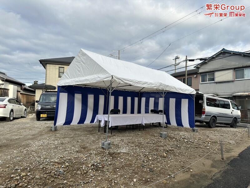 地鎮祭とは、建築工事や土木工事を行う前に、土地の神様を祀り、工事の安全や土地・ 建物の末永い安全を祈願する儀式です。 株式会社繁栄はテントレンタル・式典&地鎮祭レンタル・地鎮祭セット設営 地鎮祭テント・用品全般レンタル致します。