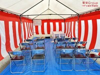 地鎮祭とは、建築工事や土木工事を行う前に、土地の神様を祀り、工事の安全や土地・ 建物の末永い安全を祈願する儀式です。 株式会社繁栄はテントレンタル・式典&地鎮祭レンタル・地鎮祭セット設営 地鎮祭テント・用品全般レンタル致します。