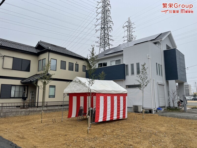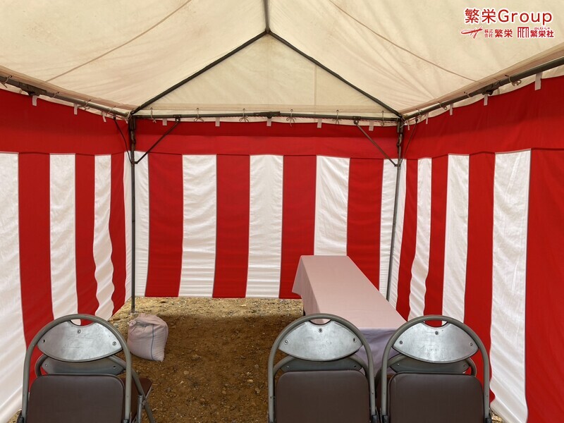 地鎮祭とは、建築工事や土木工事を行う前に、土地の神様を祀り、工事の安全や土地・ 建物の末永い安全を祈願する儀式です。 株式会社繁栄はテントレンタル・式典&地鎮祭レンタル・地鎮祭セット設営 地鎮祭テント・用品全般レンタル致します。