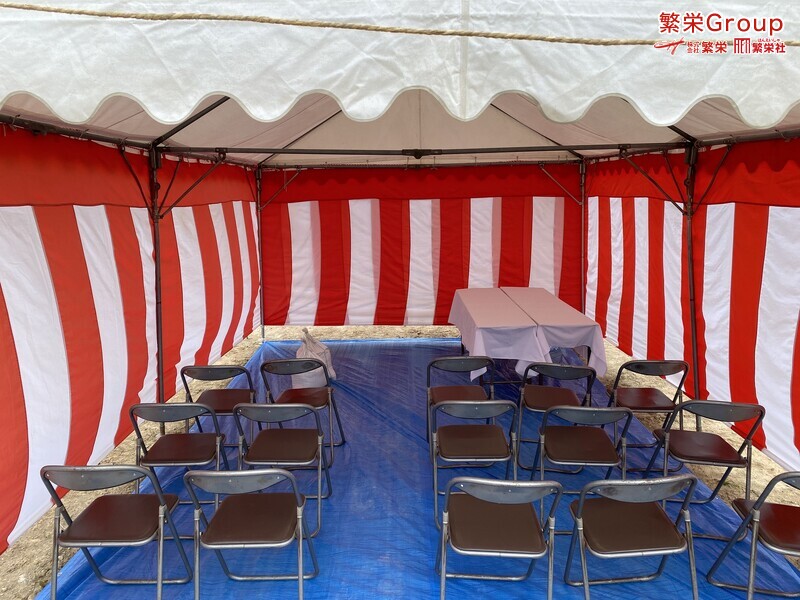 地鎮祭とは、建築工事や土木工事を行う前に、土地の神様を祀り、工事の安全や土地・ 建物の末永い安全を祈願する儀式です。 株式会社繁栄はテントレンタル・式典&地鎮祭レンタル・地鎮祭セット設営 地鎮祭テント・用品全般レンタル致します。