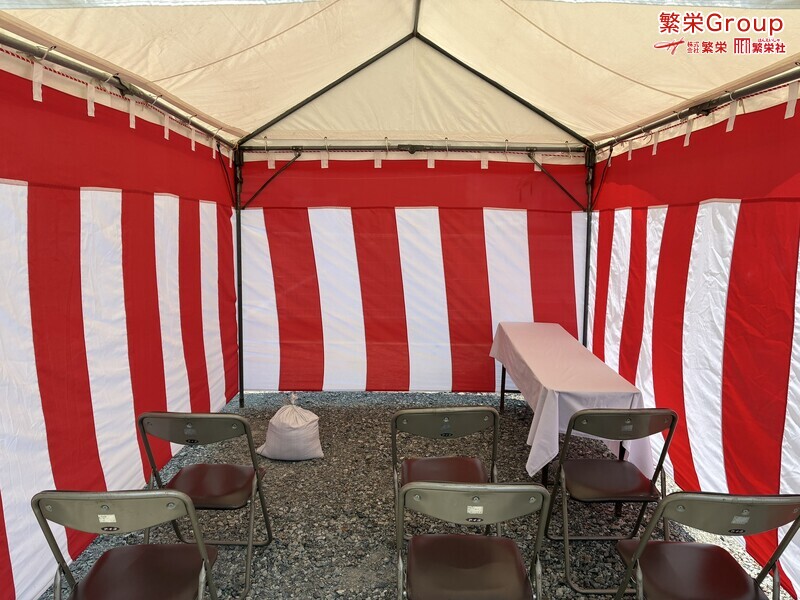 地鎮祭とは、建築工事や土木工事を行う前に、土地の神様を祀り、工事の安全や土地・ 建物の末永い安全を祈願する儀式です。 株式会社繁栄はテントレンタル・式典&地鎮祭レンタル・地鎮祭セット設営 地鎮祭テント・用品全般レンタル致します。