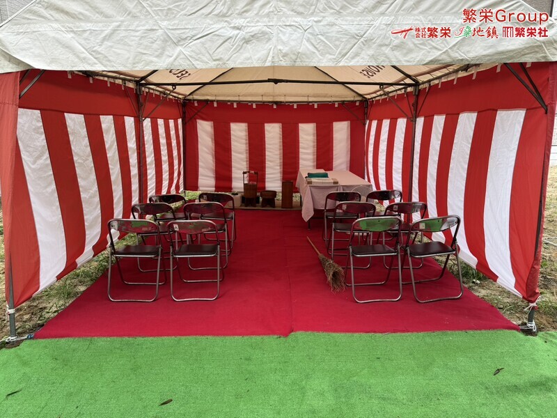 地鎮祭とは、建築工事や土木工事を行う前に、土地の神様を祀り、工事の安全や土地・ 建物の末永い安全を祈願する儀式です。 株式会社繁栄はテントレンタル・式典&地鎮祭レンタル・地鎮祭セット設営 地鎮祭テント・用品全般レンタル致します。
