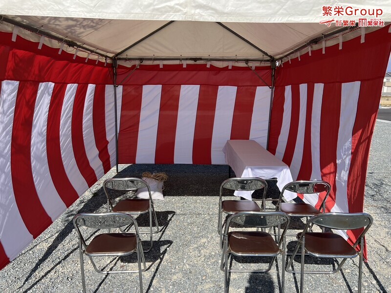 地鎮祭とは、建築工事や土木工事を行う前に、土地の神様を祀り、工事の安全や土地・ 建物の末永い安全を祈願する儀式です。 株式会社繁栄はテントレンタル・式典&地鎮祭レンタル・地鎮祭セット設営 地鎮祭テント・用品全般レンタル致します。