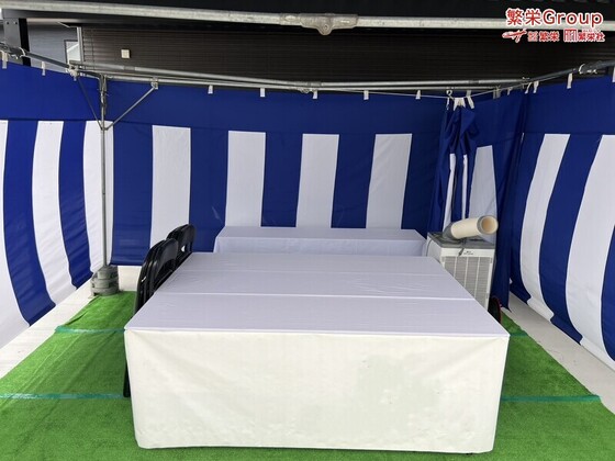 テント1.5×2間/紅白幕1枚/長方形テーブル(白クロス付)3台/パイプイス5脚