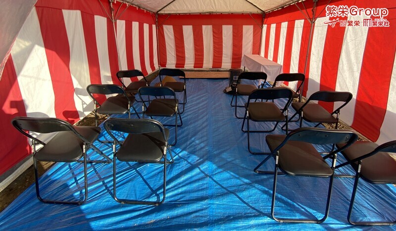地鎮祭とは、建築工事や土木工事を行う前に、土地の神様を祀り、工事の安全や土地・ 建物の末永い安全を祈願する儀式です。 株式会社繁栄はテントレンタル・式典&地鎮祭レンタル・地鎮祭セット設営 地鎮祭テント・用品全般レンタル致します。