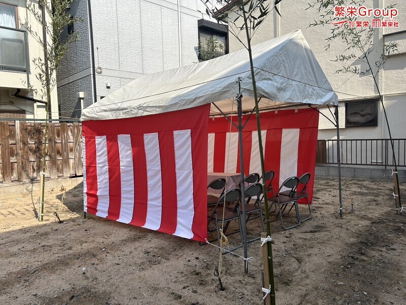 地鎮祭とは、建築工事や土木工事を行う前に、土地の神様を祀り、工事の安全や土地・ 建物の末永い安全を祈願する儀式です。 株式会社繁栄はテントレンタル・式典&地鎮祭レンタル・地鎮祭セット設営 地鎮祭テント・用品全般レンタル致します。