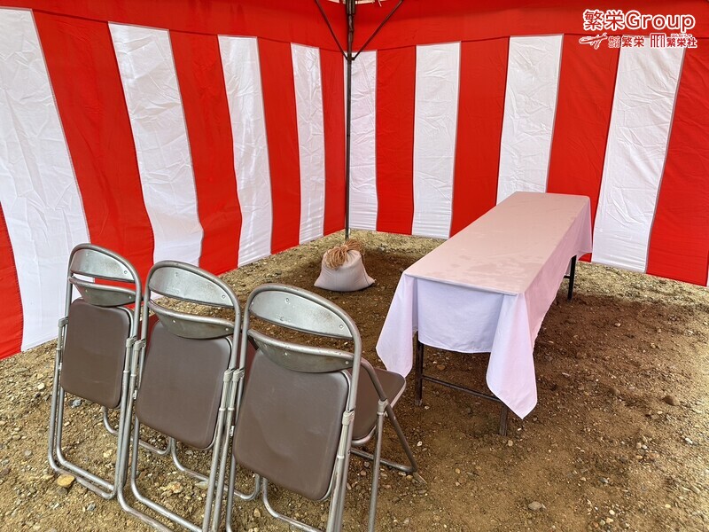 地鎮祭とは、建築工事や土木工事を行う前に、土地の神様を祀り、工事の安全や土地・ 建物の末永い安全を祈願する儀式です。 株式会社繁栄はテントレンタル・式典&地鎮祭レンタル・地鎮祭セット設営 地鎮祭テント・用品全般レンタル致します。