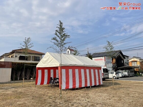 地鎮祭とは、建物の新築や土木工事の起工の際などにその土地の神様を祀り工事の無事進行・完了と土地・建造物が末長く安全堅固であることを繁栄祈願するためにおこなわれる祭りで、国土の守護神である大地主神(おおとこぬしのかみ)と、その地域の神様である産土神(うぶすなのかみ)、その土地の神々である「此の地を宇志波伎坐大神(うしはきますおおかみ)等」をお祀りします。