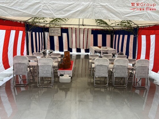 清竹4本/木杭4本/注連縄20m1本/清砂2斗/テント2間×3間/紅白幕2枚/長方形テーブル(白クロス付)2台/パイプイス12脚