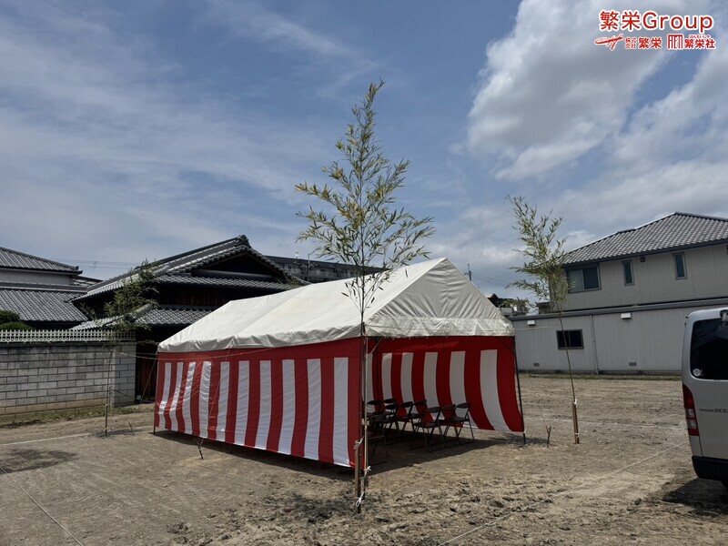 地鎮祭とは、建築工事や土木工事を行う前に、土地の神様を祀り、工事の安全や土地・ 建物の末永い安全を祈願する儀式です。 株式会社繁栄はテントレンタル・式典&地鎮祭レンタル・地鎮祭セット設営 地鎮祭テント・用品全般レンタル致します。