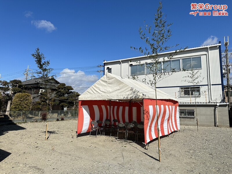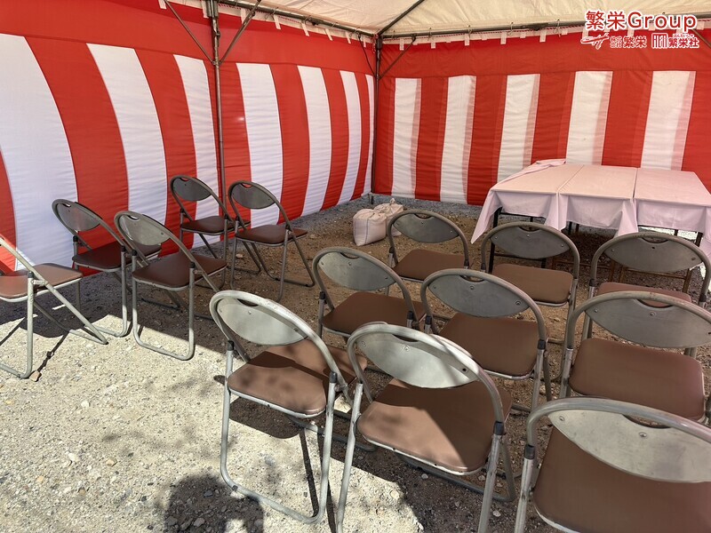 地鎮祭とは、建築工事や土木工事を行う前に、土地の神様を祀り、工事の安全や土地・ 建物の末永い安全を祈願する儀式です。 株式会社繁栄はテントレンタル・式典&地鎮祭レンタル・地鎮祭セット設営 地鎮祭テント・用品全般レンタル致します。