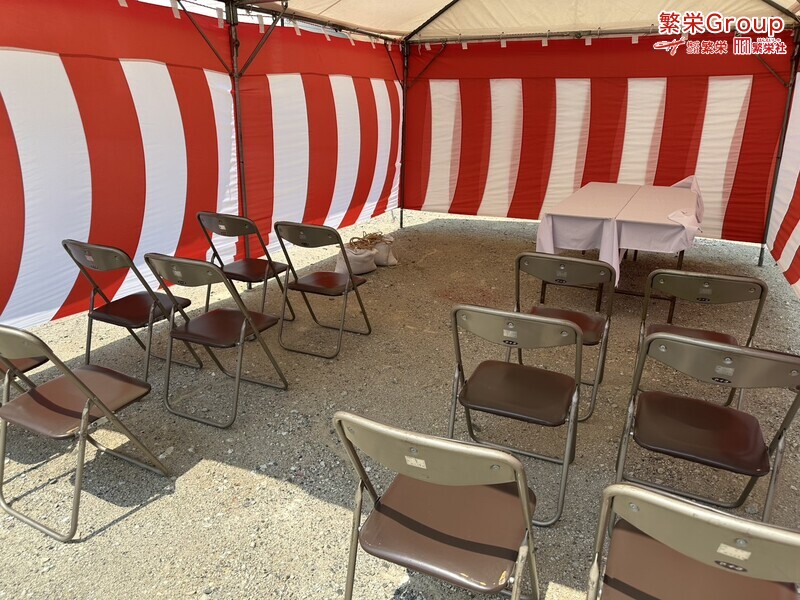地鎮祭とは、建築工事や土木工事を行う前に、土地の神様を祀り、工事の安全や土地・ 建物の末永い安全を祈願する儀式です。 株式会社繁栄はテントレンタル・式典&地鎮祭レンタル・地鎮祭セット設営 地鎮祭テント・用品全般レンタル致します。