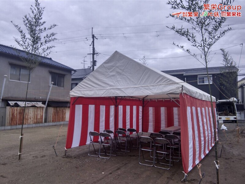 地鎮祭とは、建築工事や土木工事を行う前に、土地の神様を祀り、工事の安全や土地・ 建物の末永い安全を祈願する儀式です。 株式会社繁栄はテントレンタル・式典&地鎮祭レンタル・地鎮祭セット設営 地鎮祭テント・用品全般レンタル致します。