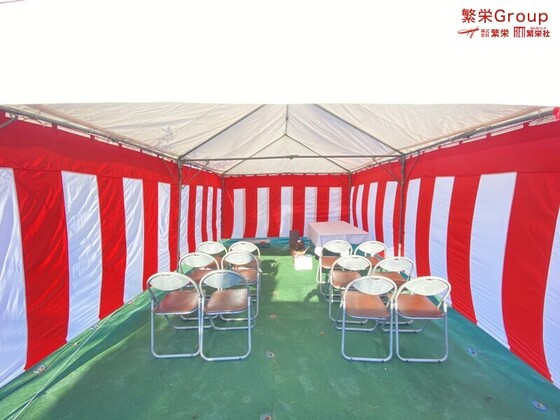 清竹4本/木杭4本/注連縄20m1本/清砂2斗/テント2間×3間/紅白幕2枚/長方形テーブル(白クロス付)2台/パイプイス12脚
