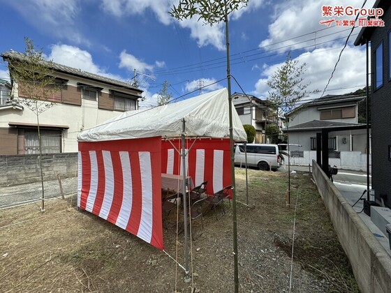 地鎮祭とは、建物の新築や土木工事の起工の際などにその土地の神様を祀り工事の無事進行・完了と土地・建造物が末長く安全堅固であることを繁栄祈願するためにおこなわれる祭りで、国土の守護神である大地主神(おおとこぬしのかみ)と、その地域の神様である産土神(うぶすなのかみ)、その土地の神々である「此の地を宇志波伎坐大神(うしはきますおおかみ)等」をお祀りします。
