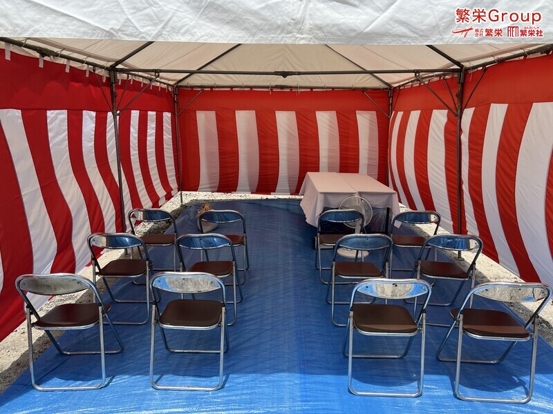 地鎮祭とは、建築工事や土木工事を行う前に、土地の神様を祀り、工事の安全や土地・ 建物の末永い安全を祈願する儀式です。 株式会社繁栄はテントレンタル・式典&地鎮祭レンタル・地鎮祭セット設営 地鎮祭テント・用品全般レンタル致します。