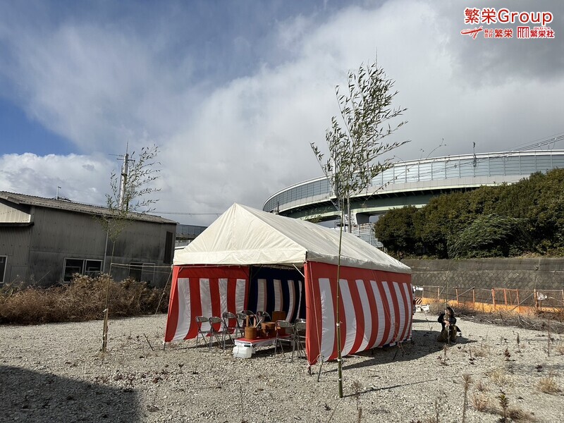 地鎮祭とは、建築工事や土木工事を行う前に、土地の神様を祀り、工事の安全や土地・ 建物の末永い安全を祈願する儀式です。 株式会社繁栄はテントレンタル・式典&地鎮祭レンタル・地鎮祭セット設営 地鎮祭テント・用品全般レンタル致します。