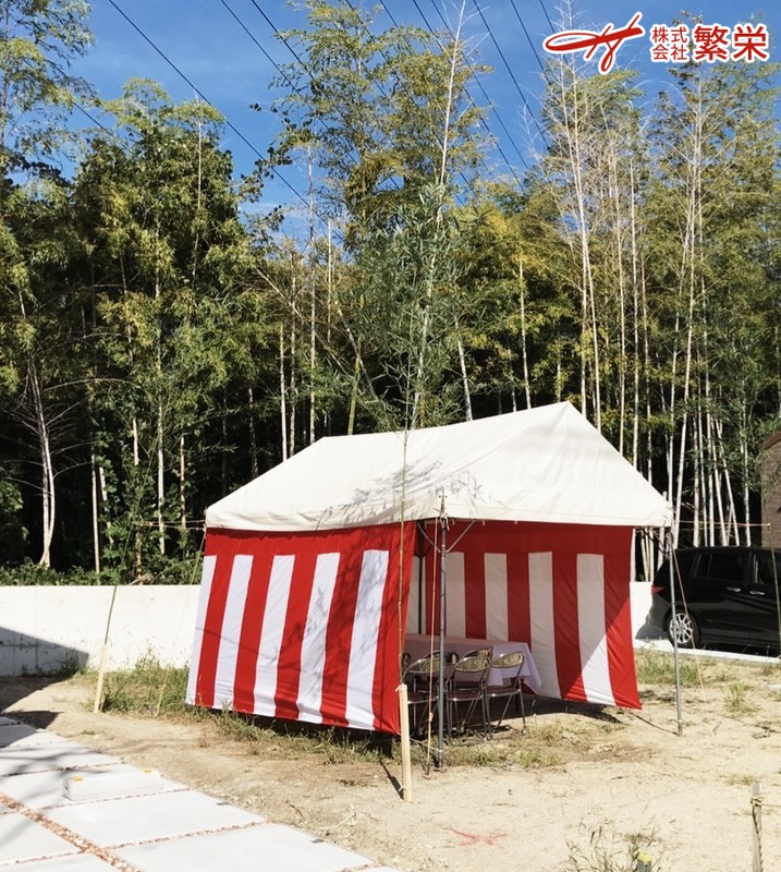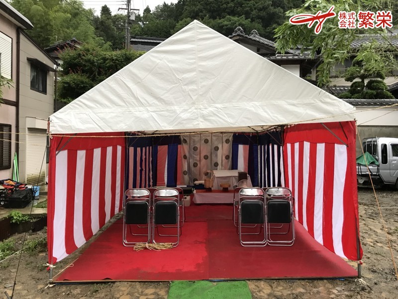 関西で地鎮祭テントご手配予定の施工会社様、工務店様、業者様、個人様へ 地鎮祭テント・四方竹の販売・地鎮祭の準備(手配)・地鎮祭用品レンタルの事なら 引き渡しセレモニー準備(手配)・テープカット準備(手配)・ヘリウムガスレンタル等 地鎮祭会場・会場設営(建築工事の三大祭式)の事なら何なりとお申し付け下さい。 レンタルのことなら大阪・兵庫・奈良に営業所のある 株式会社繁栄 まで・・ 地鎮祭なら大阪・神戸・奈良・関西・四国・九州までどこまでも自社便で・・ 現場見学会テント設営/施工・完成見学会テント・構造見学会テント設営や 内覧会会場準備・現地/現場公開イベントのことなら 株式会社繁栄 まで・・ 大阪・兵庫・奈良・近畿の地鎮祭なら迅速な対応致します。株式会社繁栄まで・・