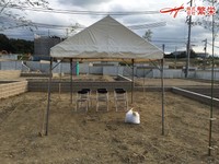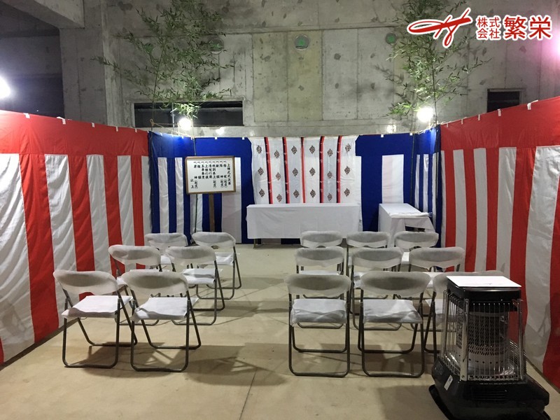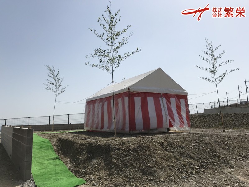 株式会社繁栄は地鎮祭会場設営にて工事の無事・家内繁栄を祈願致します。