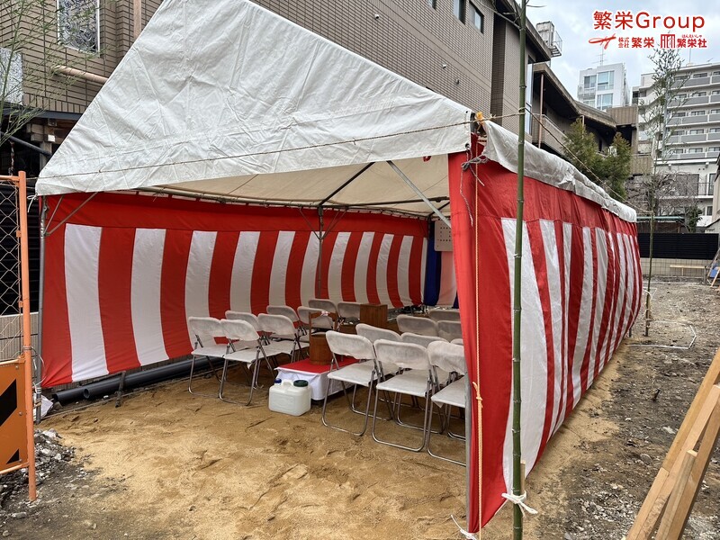 地鎮祭とは、建築工事や土木工事を行う前に、土地の神様を祀り、工事の安全や土地・ 建物の末永い安全を祈願する儀式です。 株式会社繁栄はテントレンタル・式典&地鎮祭レンタル・地鎮祭セット設営 地鎮祭テント・用品全般レンタル致します。