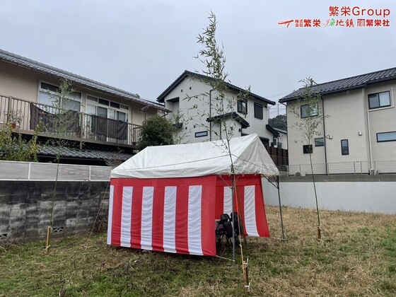 地鎮祭とは、建物の新築や土木工事の起工の際などにその土地の神様を祀り工事の無事進行・完了と土地・建造物が末長く安全堅固であることを繁栄祈願するためにおこなわれる祭りで、国土の守護神である大地主神(おおとこぬしのかみ)と、その地域の神様である産土神(うぶすなのかみ)、その土地の神々である「此の地を宇志波伎坐大神(うしはきますおおかみ)等」をお祀りします。