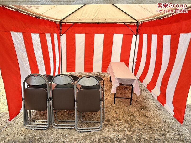 地鎮祭とは、建築工事や土木工事を行う前に、土地の神様を祀り、工事の安全や土地・ 建物の末永い安全を祈願する儀式です。 株式会社繁栄はテントレンタル・式典&地鎮祭レンタル・地鎮祭セット設営 地鎮祭テント・用品全般レンタル致します。