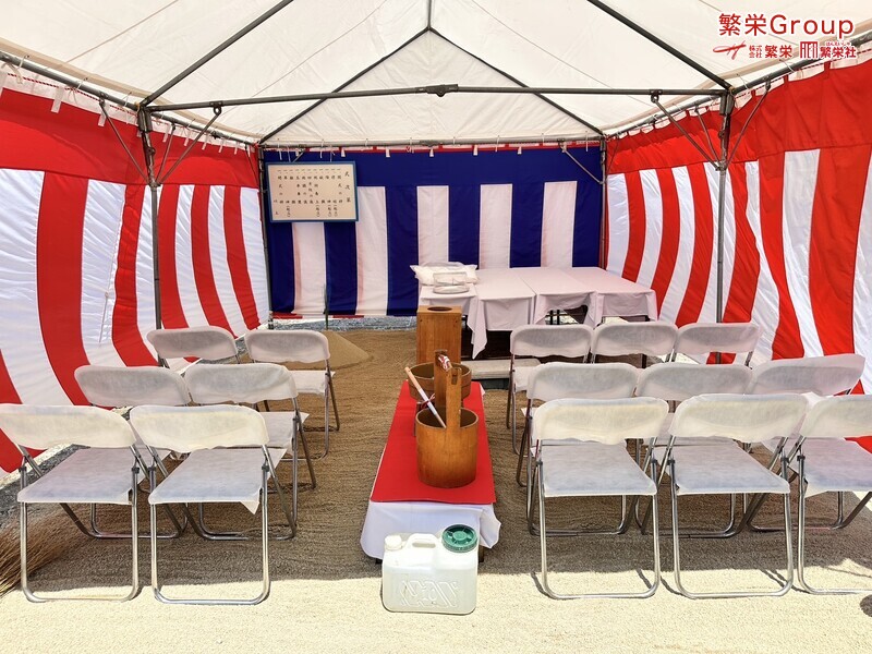 地鎮祭とは、建築工事や土木工事を行う前に、土地の神様を祀り、工事の安全や土地・ 建物の末永い安全を祈願する儀式です。 株式会社繁栄はテントレンタル・式典&地鎮祭レンタル・地鎮祭セット設営 地鎮祭テント・用品全般レンタル致します。
