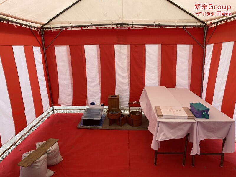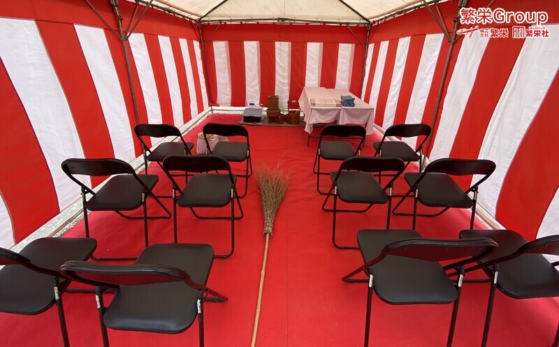 地鎮祭とは、建築工事や土木工事を行う前に、土地の神様を祀り、工事の安全や土地・ 建物の末永い安全を祈願する儀式です。 株式会社繁栄はテントレンタル・式典&地鎮祭レンタル・地鎮祭セット設営 地鎮祭テント・用品全般レンタル致します。