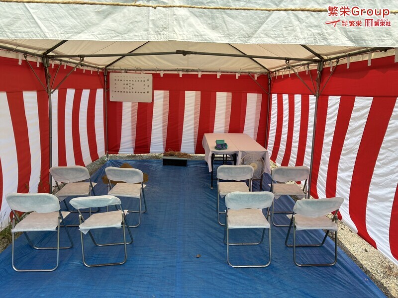 地鎮祭とは、建築工事や土木工事を行う前に、土地の神様を祀り、工事の安全や土地・ 建物の末永い安全を祈願する儀式です。 株式会社繁栄はテントレンタル・式典&地鎮祭レンタル・地鎮祭セット設営 地鎮祭テント・用品全般レンタル致します。