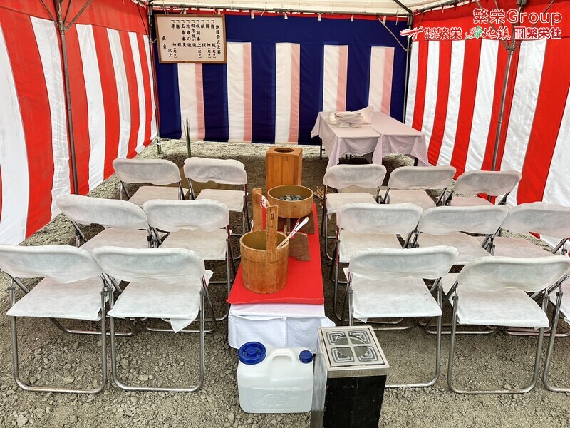 地鎮祭とは、建築工事や土木工事を行う前に、土地の神様を祀り、工事の安全や土地・ 建物の末永い安全を祈願する儀式です。 株式会社繁栄はテントレンタル・式典&地鎮祭レンタル・地鎮祭セット設営 地鎮祭テント・用品全般レンタル致します。