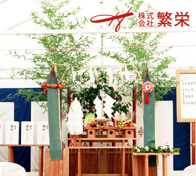 株式会社繁栄は地鎮祭テントの設営・レンタル施工致します。  竣工式準備(用意/手配)・仮設テント(用意/手配)・上棟式準備(用意/手配)竣工式会場設営 テー