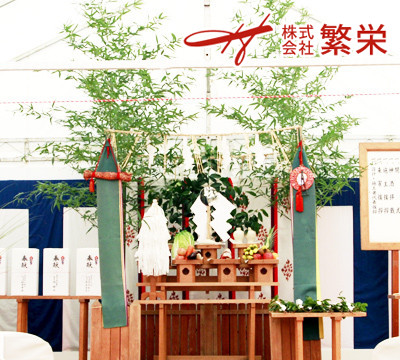 地鎮祭・上棟式・竣工式や各種式典・イベント会場設営・施工なら株式会社繁栄へ レンタル商品・式典用の四方竹セット・お供え物準備の事なら株式会社繁栄へ 竣工時のお引き渡しセレモニー・テープカット・バルーンの準備なら繁栄へ 神事用品レンタル・祭事用品レンタル・式典用品レンタルのことなら繁栄へ 株式会社繁栄は神社御紹介、神主様ご紹介も致しております。 地鎮祭テント・竣工式テントなら繁栄に何なりとお申し付け下さい。